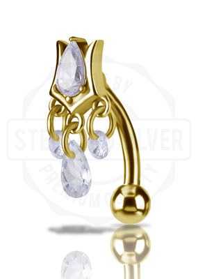 GOLD PVD SS316L BELLY BANANA SET W. CUBIC ZIRCONIA AND PEAR DROP DANGLE