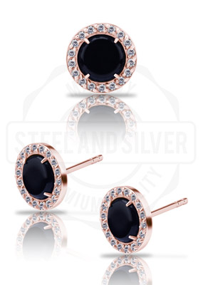 GOLD PVD BLACK 6MM AGATE EARSTUDS W. HALO PAVE FRAME