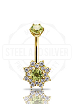 18K GOLD INT. THREADED NAVEL BANANA SET W. GENUINE PERIDOT AND PREMIUM ZIRCONIA