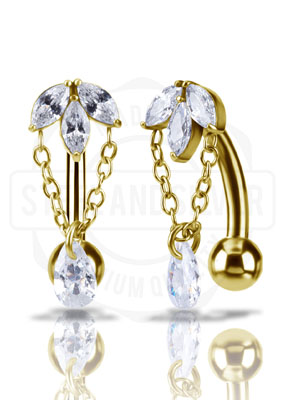 GOLD PVD SS316L BELLY BANANA SET W. CUBIC ZIRCONIA AND PEAR DROP DANGLES