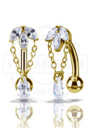 GOLD PVD SS316L BELLY BANANA SET W. CUBIC ZIRCONIA AND ROUND DROP DANGLES