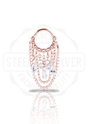 ROSE GOLD PVD SS316L HINGED RING WITH PEAR SHAPE AND ROUND STONE DANGLES